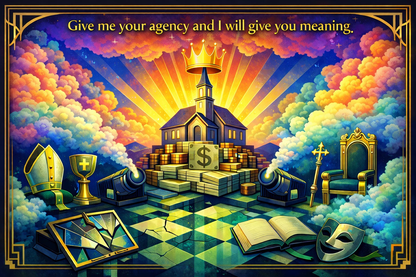 It says, “Give me your agency and I will give you meaning.”